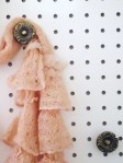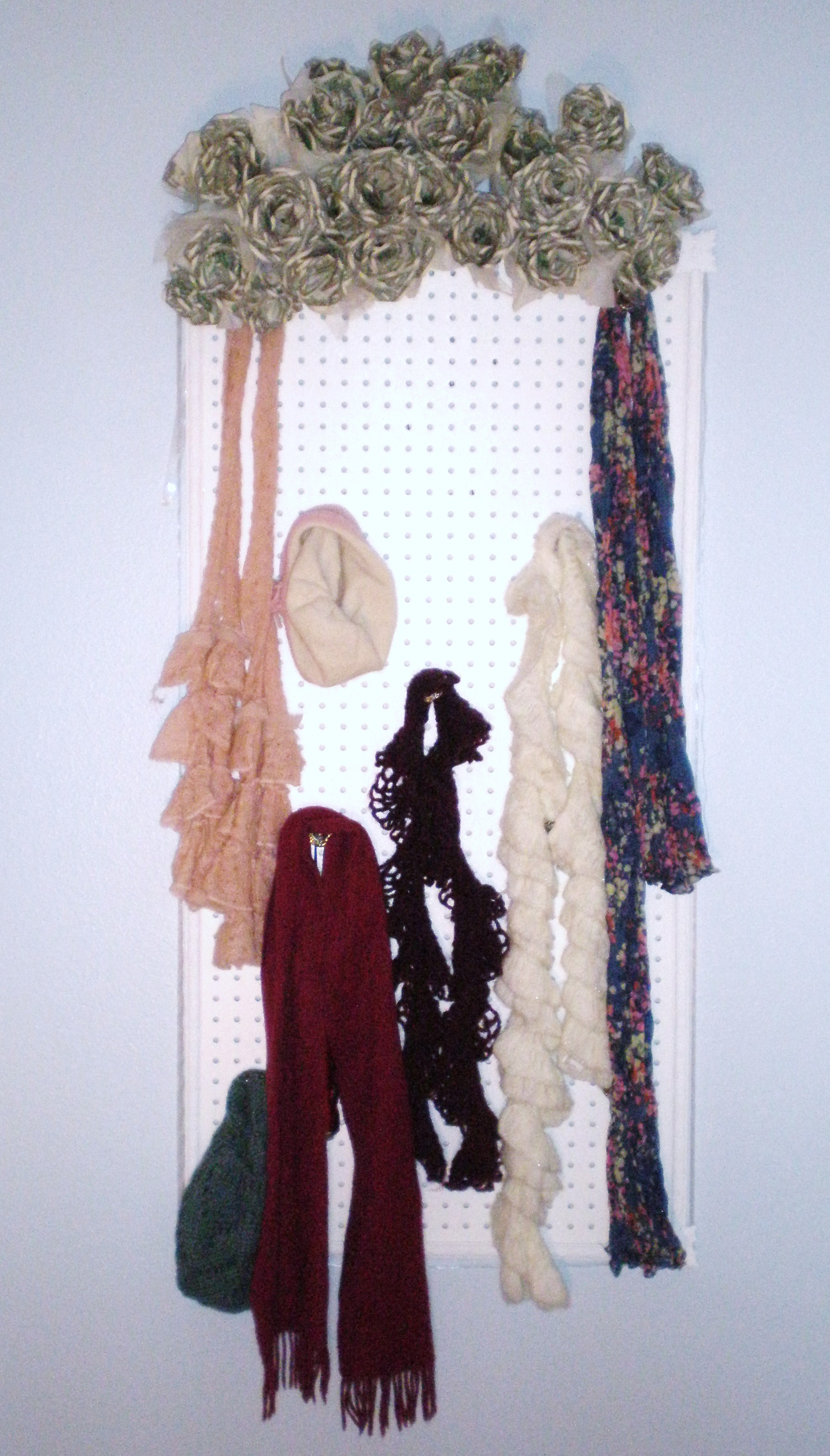 To create this look for your room, simply screw the cabinet knobs onto a pegboard, spacing them out however you desire. Be creative and imaginative! Look around the house for old knobs or other objects that can be used as handles to hold your accessories. Once the knobs are tightly screwed in, place the pegboard inside a glassless picture frame, secure it in place and then hang it in your desired location!