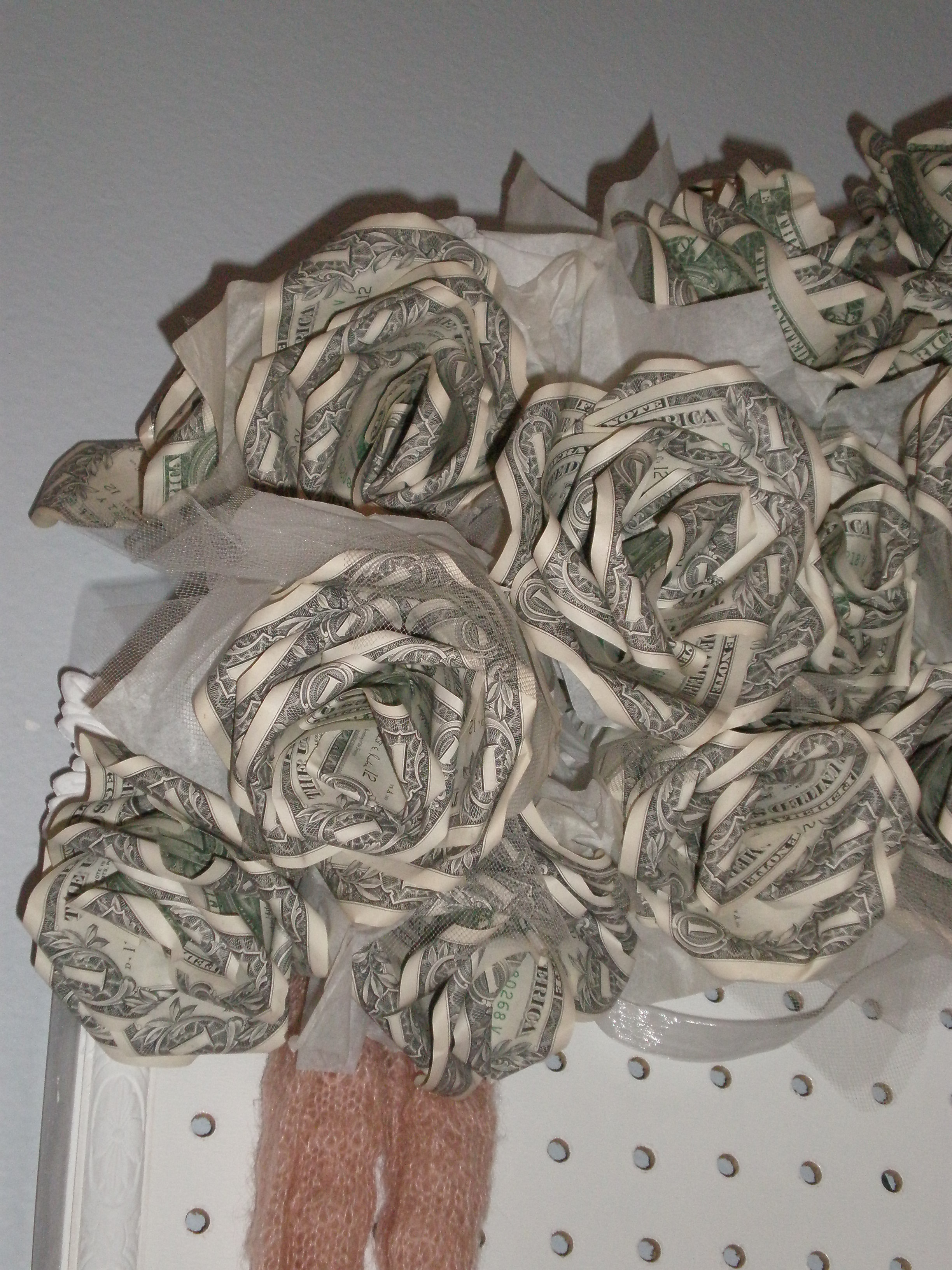 In 2004 when I completed my undergraduate program, my mom asked my cousins to make a bouquet of 2 dozen roses out of crisp $1 bills as a graduation gift. I’ve had it on display in my room ever since. However, when we moved to our new place I didn’t have a place for them and I didn’t have the heart to take them apart and spend the money so I decided to create a “window” of accessories repurposing the 2 dozen roses as an accent piece on the display (at the top of the frame).